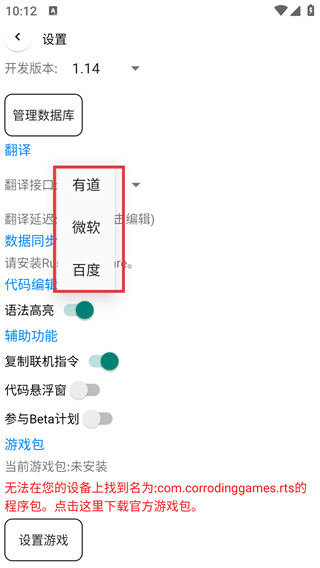 4、点击【翻译接口】下拉框,在弹出列表中选择【有道】【微软】或【百度】,更换适配的翻译接口提升体验。