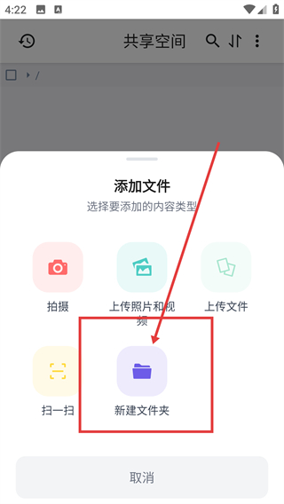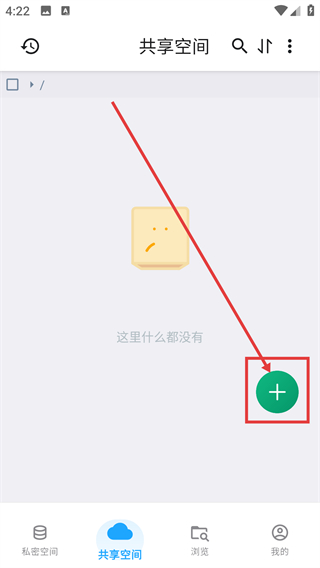 1、在共享空间页点右下角的加号按钮,能展开添加选项菜单,后续可选择添加文件或新建文件夹啦。