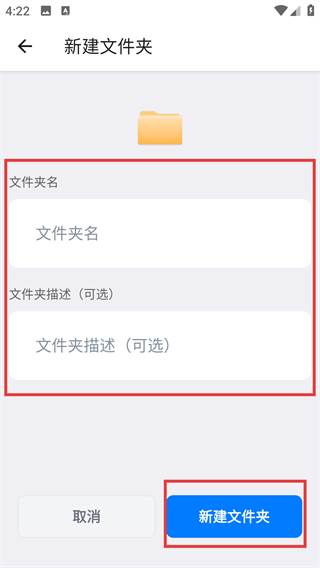 2、展开添加菜单后点【新建文件夹】选项,能进入文件夹创建页,后续可设置文件夹的名称和描述哦。