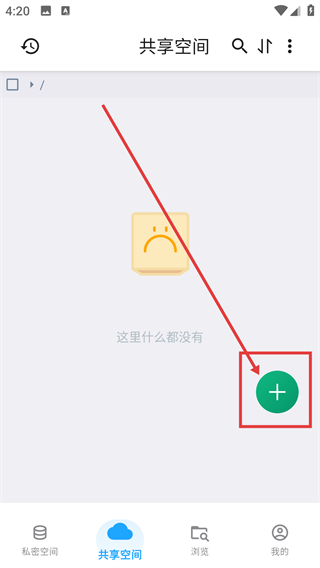 1、在【共享空间】页面点击右下角绿色加号按钮,就能打开添加文件的选项菜单,开始往空间里存内容啦。