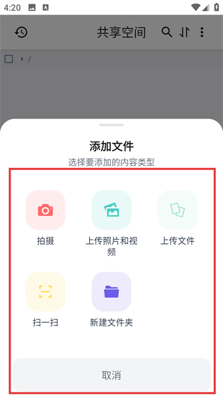 2、打开添加文件菜单后,可选择【拍摄】【上传照片和视频】等选项,按需往共享空间加内容哦。