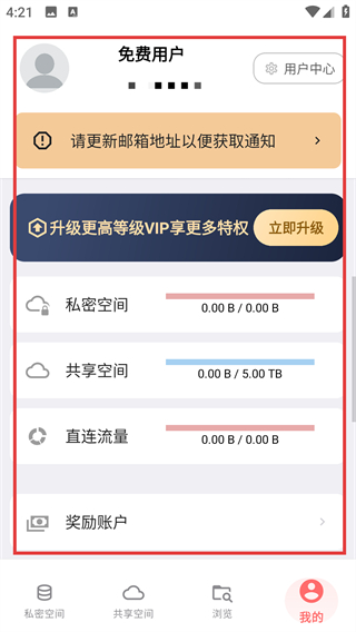 3、进入【我的】页面能看到空间容量、账户状态,点击升级提示可查看会员特权,解锁更多空间功能哦。