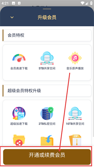 4、在升级会员页面看完特权后,点击【开通或续费会员】按钮,就能解锁高速下载、大空间等特权啦。