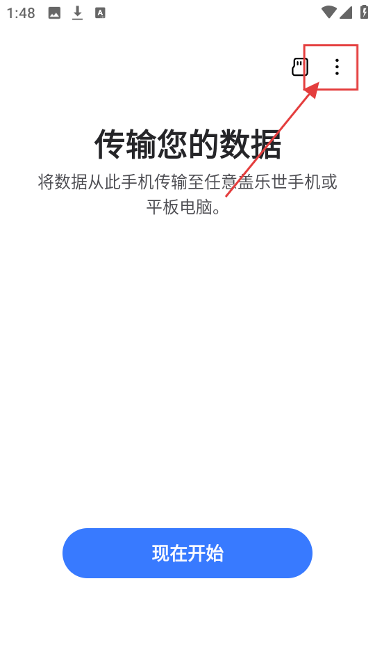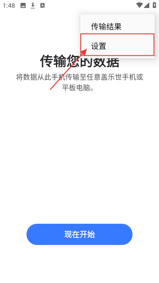 1、在【传输您的数据】界面,点击右上角的三点图标,会弹出包含【传输结果】和【设置】的菜单哟。