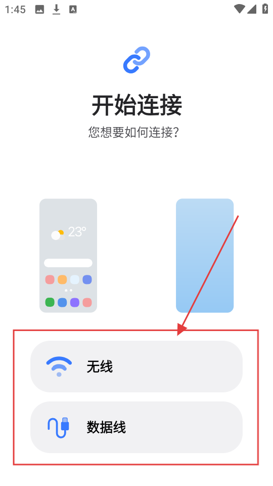 2、【开始连接】页面有【无线】和【数据线】两种连接方式,按需选择即可进行对应方式的连接操作哟。