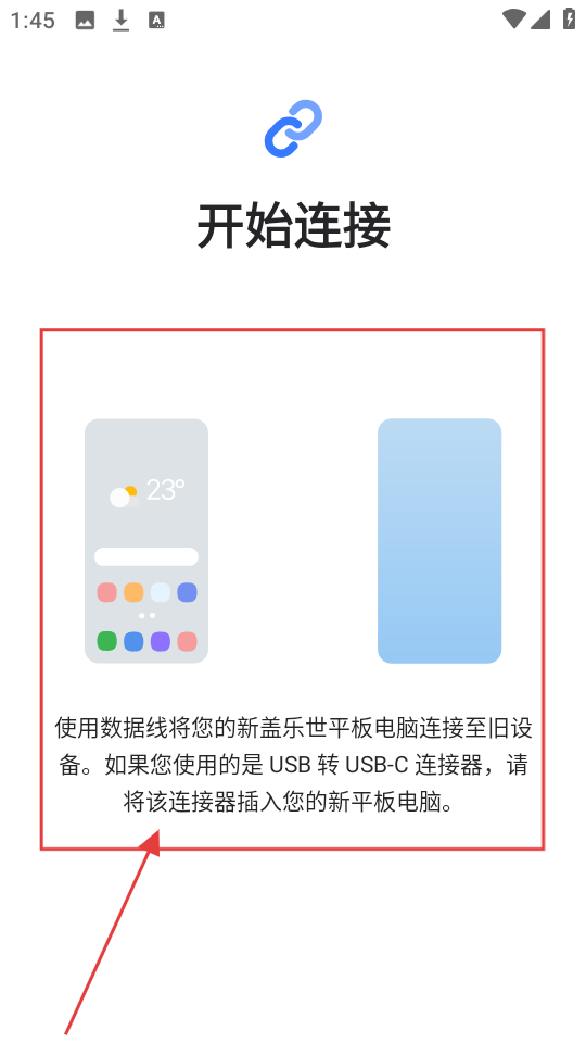 4、若选数据线连接,按照提示用数据线将新盖乐世平板电脑连接至旧设备,使用USB转USB-C连接器时插入新平板即可。
