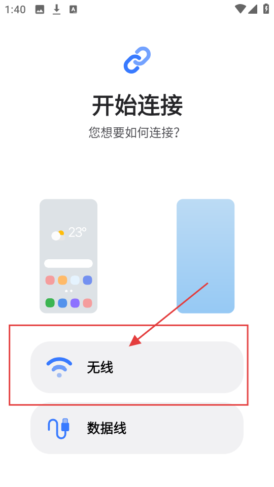 2、开始连接页面里,有【无线】和【数据线】两种连接方式,选【无线】就能用无线方式连接设备哟。