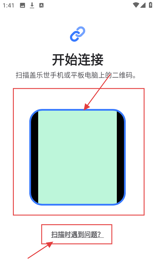 3、接着会进入扫码连接页面,用设备扫描盖乐世设备上的二维码,要是遇到问题,点【扫描时遇到问题?】能获取帮助。
