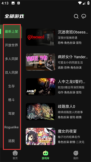 2、进入游戏库后可通过左侧分类栏(比如【最新上架】)筛选游戏,快速找到感兴趣的类型哦。