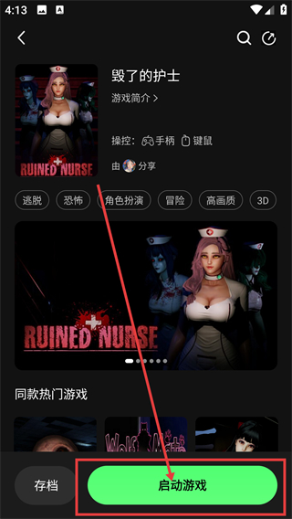 4、进入目标游戏(比如【毁了的护士】)详情页后,点击【启动游戏】按钮就能开始游玩啦。