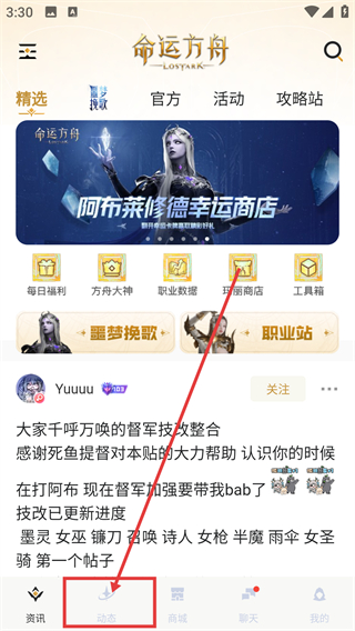 1、在命运方舟首页点底部的【动态】选项,能进入玩家动态页,后续可查看或发布游戏相关内容啦。