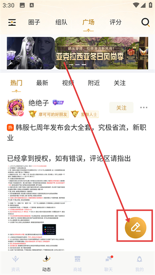 2、进入动态页后点右下角的编辑按钮,能打开发布动态的页面,后续可编辑内容分享游戏心得哦。