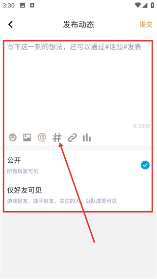 3、在发布动态页点话题按钮,能打开话题选择列表,后续可挑选适配的话题来关联动态内容啦。