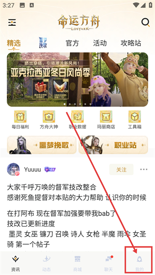 1、在【命运方舟】首页点击底部【我的】选项,就能进入个人页面,准备管理自己的游戏角色信息啦。