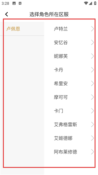 4、在区服选择页,可从【卢佩恩】【卢特兰】等区服列表里选择角色所在区服,继续完成角色绑定哦。