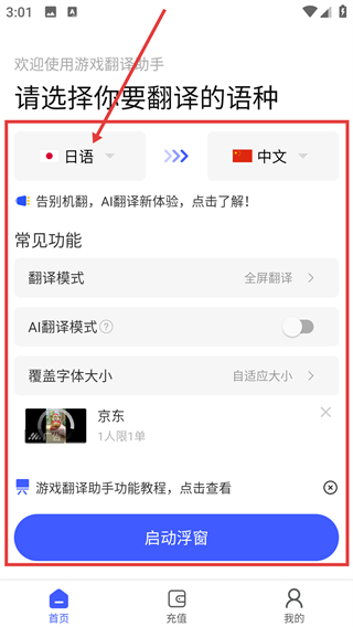 1、在首页选择要翻译的源语种(比如【日语】)和目标语种,再点击【启动浮窗】就能开启翻译功能啦。