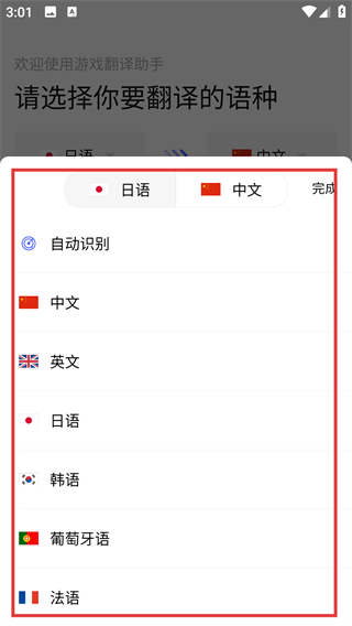 2、点击语种选择框后,会展开语种列表,可从中选择【中文】【英文】等目标语种,选好后点完成哦。