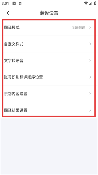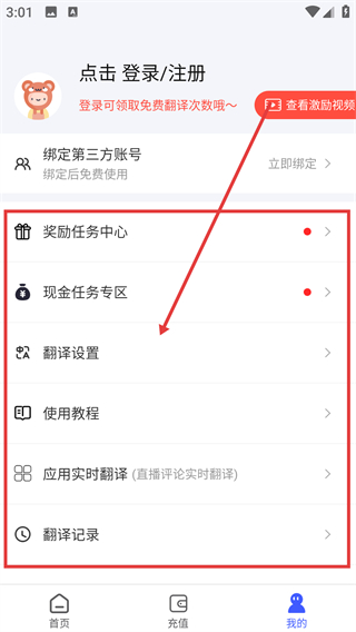 3、进入我的页面后,点击【翻译设置】选项,就能进入设置界面,调整翻译相关的功能参数啦。