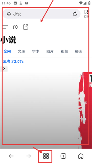 2、搜索后进入结果页,可切换【全网】【文库】等分类筛选内容,点击底部图标能打开菜单哦。