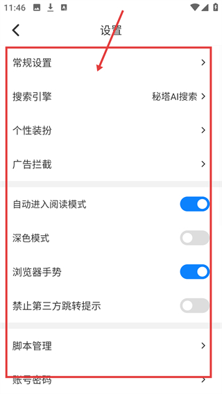 4、在设置页可调整【自动进入阅读模式】等开关,还能进入【常规设置】细化更多功能参数哦。