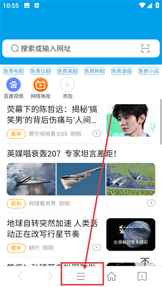 1、在浏览页点底部的菜单按钮,能展开功能选项栏,后续可按需选择设置等功能调整浏览配置啦。