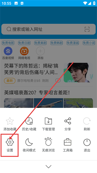 2、展开功能栏后点【设置】选项,能进入设置页面,这里有各类浏览相关的配置项可调整哦。
