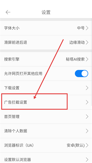 3、在设置页点【广告拦截设置】选项,就能进入对应的配置页面,调整广告拦截的相关参数啦。