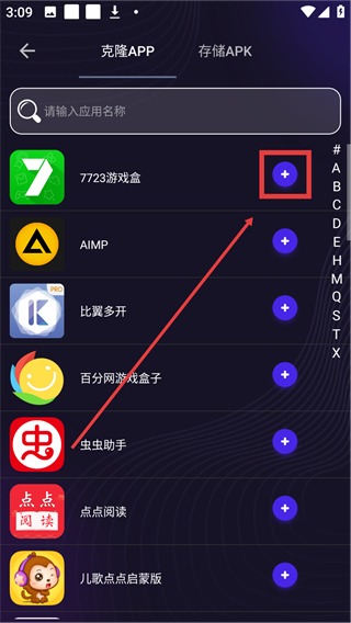 2、进入克隆APP页后,找到要克隆的【7723游戏盒】,点它右侧的加号按钮就能添加啦。