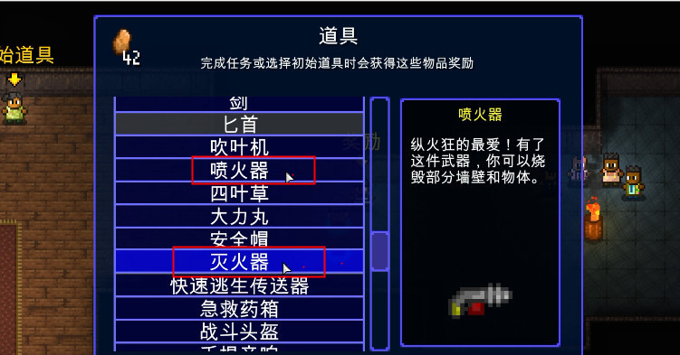 2、玩家要先完成任务,选择初始道具,解锁喷火器和灭火器。