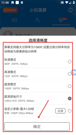 3、在清晰度选择页,挑选想要的清晰度选项后点击【确定】,就能完成录屏画质的设置啦。