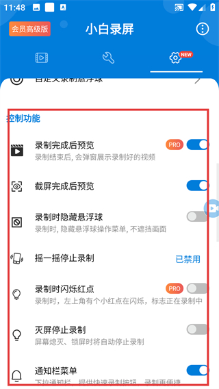 4、在控制功能页,可开启或关闭【录制完成后预览】等功能,按需调整录屏的辅助选项哦。