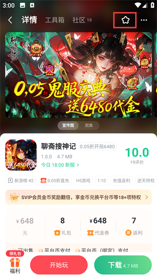 1、在首页找到目标游戏(比如【聊斋搜神记】),点击进入详情页,就能查看游戏的福利和玩法信息啦。