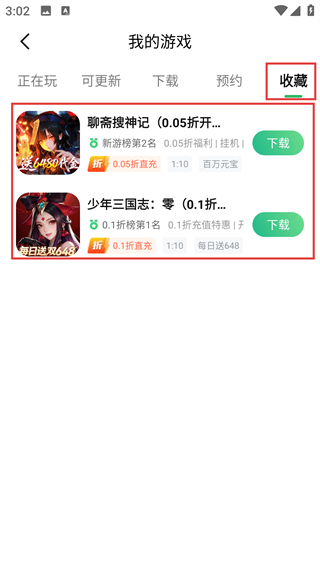 4、在我的游戏页切换到【收藏】标签,就能看到已收藏的游戏列表,想玩的时候直接点下载就能开始啦。