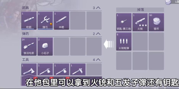 5、击败黄三炮后我们就可以从他身上拿到火铳,五发子弹以及钥匙。