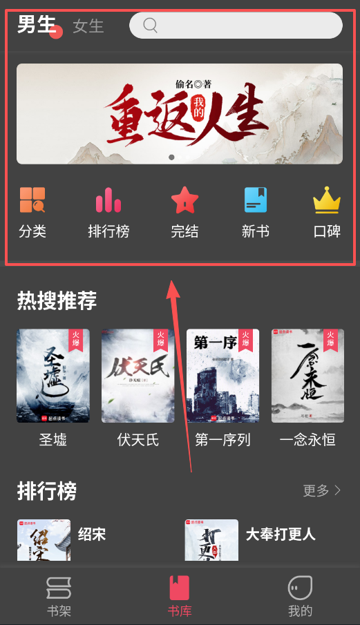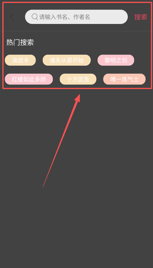 2、想找特定小说的话呢,在书库页面顶部找到搜索框,输入书名或作者名就行啦。