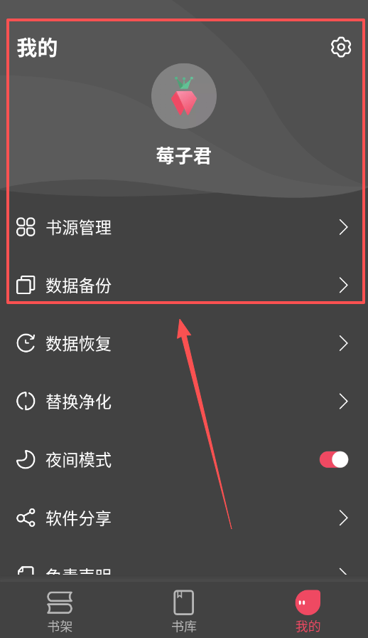 4、在“我的”页面里,你可以进行书源管理、数据备份与恢复,还能设置替换净化规则和切换夜间模式。