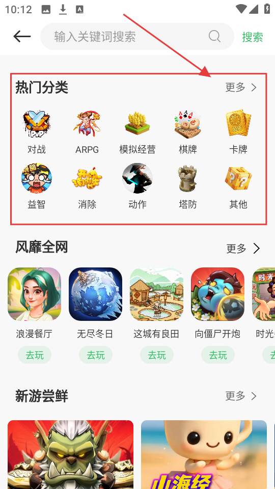2、小游戏界面有【热门分类】,对战、ARPG等类型多样,选喜欢的分类找游戏吧。
