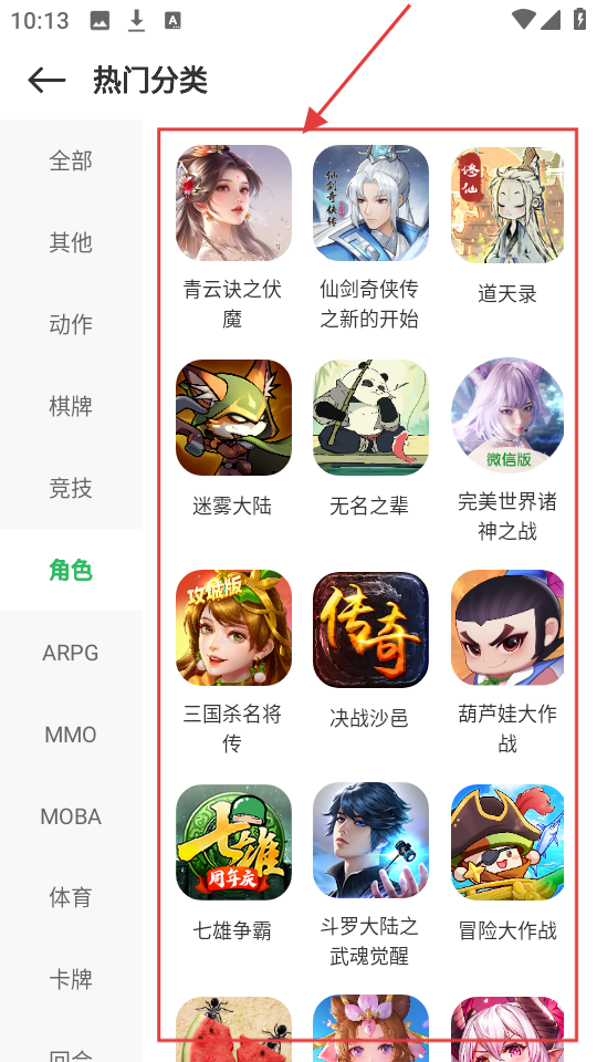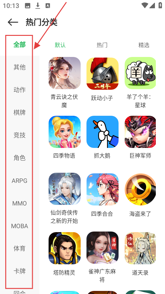 3、热门分类左侧有全部、动作、棋牌等分类栏,按需选择能快速找到心仪游戏呢。