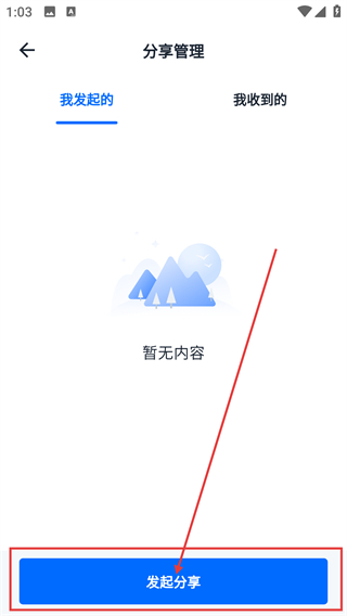 2、进入分享管理页后,点击底部的【发起分享】按钮,就能打开选择目标文件的界面,准备挑选要分享的文件哦。