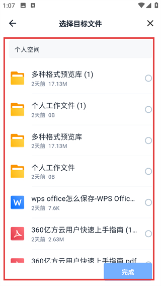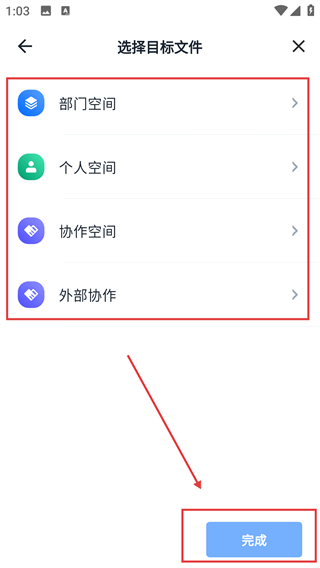 3、在选择目标文件页选择对应的空间分类,选好后点击【完成】,就能进入该空间的文件列表页面啦。