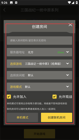 3、在创建房间界面可设置密码、服务器、游戏版本等参数,选好后点【创建联机房间】就能邀好友一起玩哦。