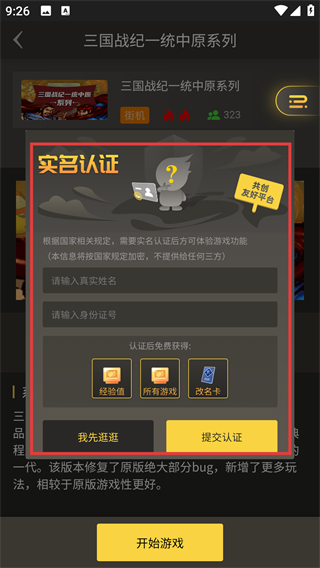 4、首次游玩会弹出【实名认证】窗口,填写真实姓名和身份证号后提交,就能解锁游戏功能并领奖励啦。