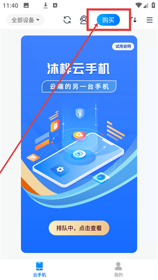 1、在【沐桦云手机】主界面点击顶部的【购买】按钮,就能进入云手机系列选择页面,开始选购啦。