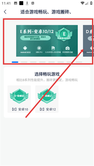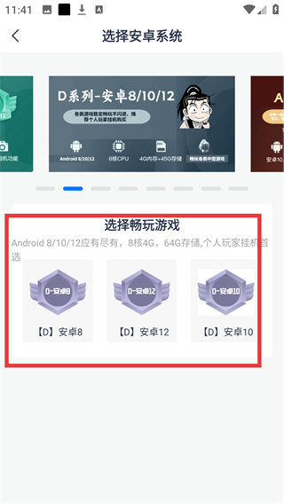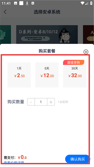 3、在系统选择界面选择想要的安卓版本,比如【D-安卓8】,就能进入对应的套餐购买弹窗啦。
