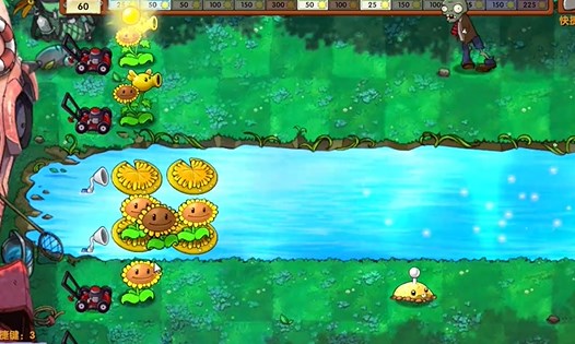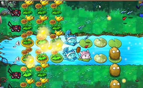 2.在上下两侧的草坪上合成多个向日葵豌豆,在泳池中合成一个寒冰猫蒲。