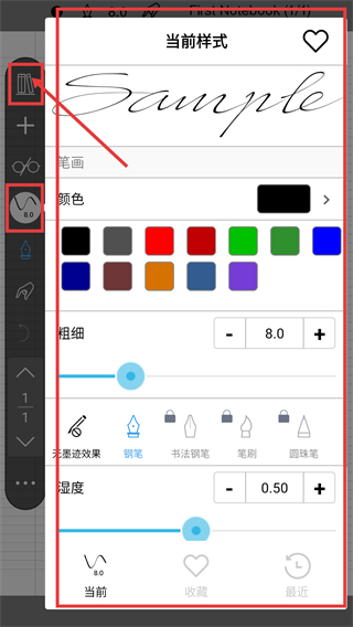 3、点样式设置按钮,能打开【当前样式】面板,可调颜色、粗细等参数,定制书写效果啦。