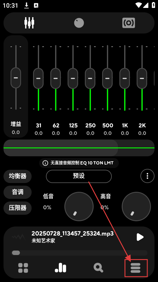 1、在音效调节界面,想进入更多设置,就点击右下角的三横线菜单按钮,这样能调出功能选项啦。