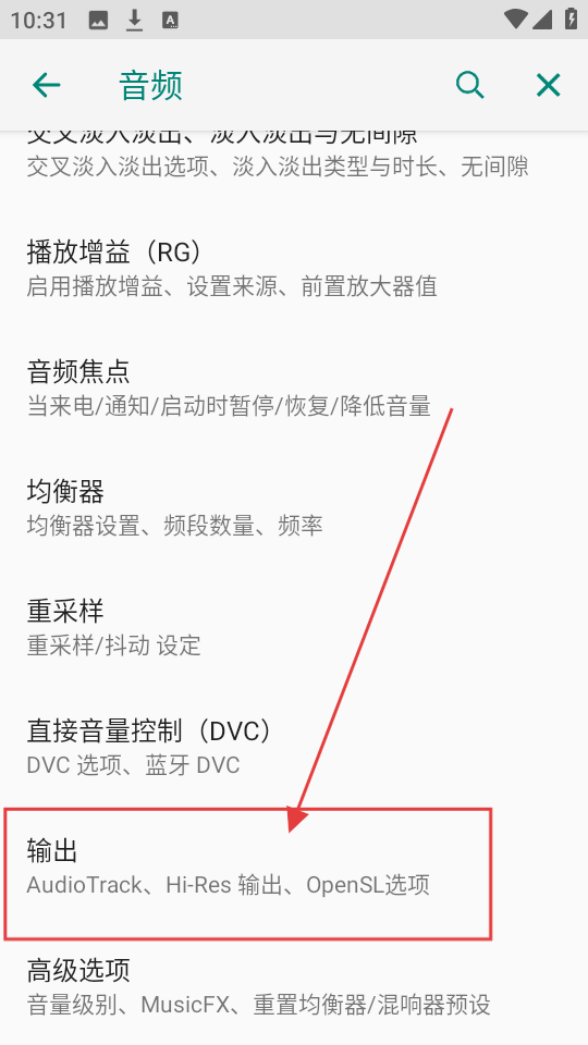 4、在音频设置里,有【输出】选项,涉及【AudioTrack】【Hi-Res-输出】等,点击可调整输出相关设置。