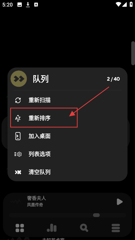 3、在功能选项菜单里,有【重新排序】选项,点击它,就可以对队列里的音乐进行排序设置啦。