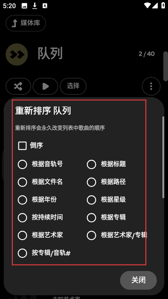 4、进入重新排序队列界面,有【倒序】【根据音轨号】等多种排序方式,选喜欢的方式,就能调整音乐顺序啦。